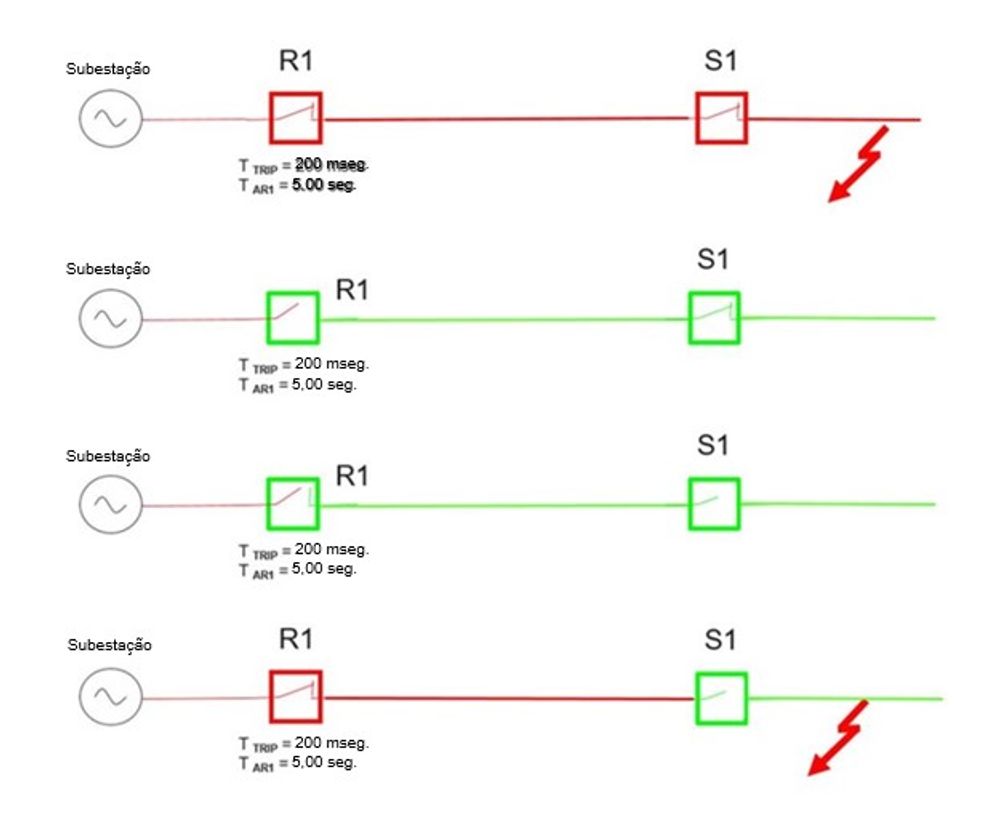 A Figura 1 mostra esse princípio em ação. Uma falta a jusante do Religador R1 e da chave seccionadora S1 causa o desarme de R1. Quando R1 desarma, o S1 sofre tanto a falta quanto a interrupção. Em seguida, ele abre antes que R1 reenergize a linha.